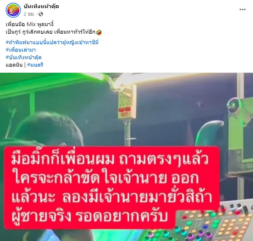 นอกจากนี้ทางเพจ ยังได้แชร์ภาพโพสต์ของบุคคลหนึ่ง บอกว่า "เพื่อนมือ Mix พูดมางี้ เป็นกูว์ กูว์เลิกคบเลย เพื่อนหาทัวร์ให้อีก #ถ้าพิมพ์มาแบบนี้แปลว่าผู้หญิงเข้าหาชิมิ" โดยข้อความดังกล่าวระบุว่า "มือมิกซ์ก็เพื่อนผม ถามตรง ๆ แล้ว ใครจะกล้าขัดใจเจ้านาย ออกแล้วนะ ลองมีเจ้านายมายั่วสิ ถ้าผู้ชายจริง รอดยากครับ"