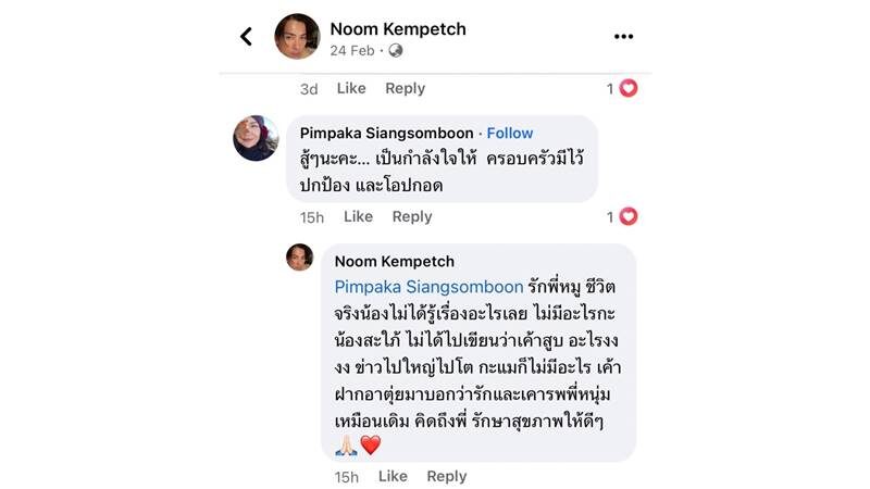 ล่าสุด (7 มีนาคม 2567) ก็พบว่า หนุ่ม เข็มเพชร ได้เคลื่อนไหวถึงเรื่องนี้ในเฟซบุ๊กส่วนตัวหลัง แม่หมู พิมพ์ผกา ได้เข้ามาคอมเมนต์ให้กำลังใจในโพสต์ของเจ้าตัวที่เคยโพสต์ไว้เมื่อวันที่ 24 กุมภาพันธ์ ที่ผ่านมา