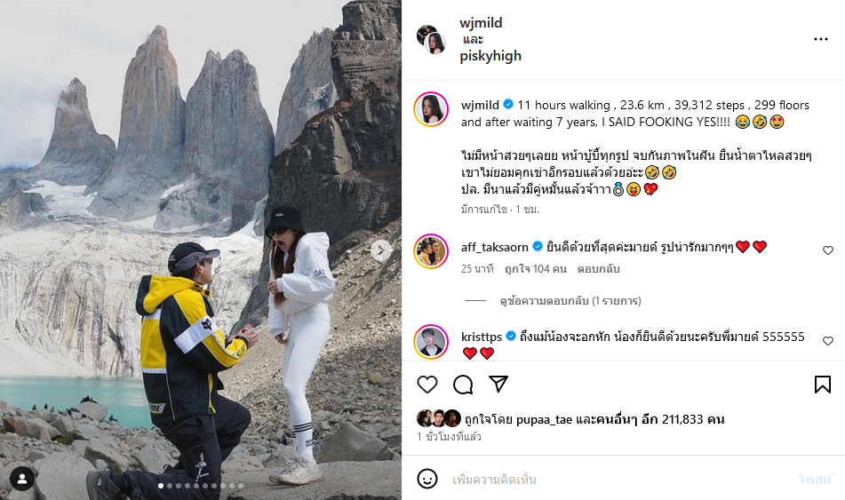 สาวมายด์ ยังได้ลงแคปชั่นแซวตัวเองด้วยว่า "11 hours walking , 23.6 km , 39,312 steps , 299 floors and after waiting 7 years, I SAID FOOKING YES !!!! ไม่มีหน้าสวย ๆ เลยย หน้าบู้บี้ทุกรูป จบกันภาพในฝัน ยืนน้ำตาไหลสวย ๆ เขาไม่ยอมคุกเข่าอีกรอบแล้วด้วยอ่ะะ ป.ล. มีนาแล้วมีคู่หมั้นแล้วจ้าาา"