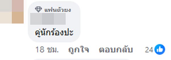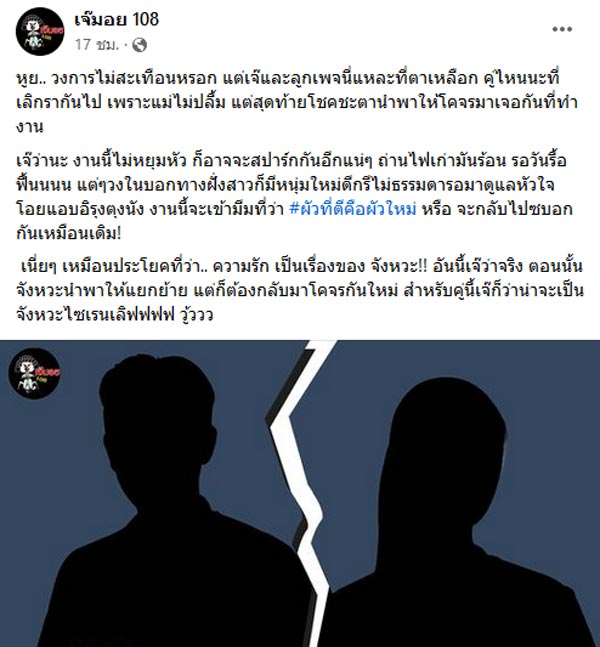 โดยระบุว่า "หูย.. วงการไม่สะเทือนหรอก แต่เจ๊และลูกเพจนี่แหละที่ตาเหลือก คู่ไหนนะที่เลิกรากันไป เพราะแม่ไม่ปลื้ม แต่สุดท้ายโชคชะตานำพาให้โคจรมาเจอกันที่ทำงาน
