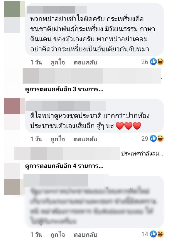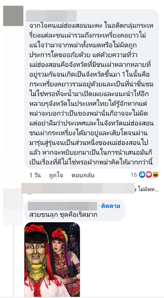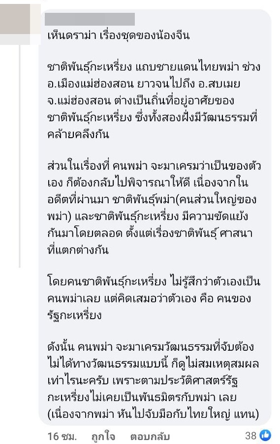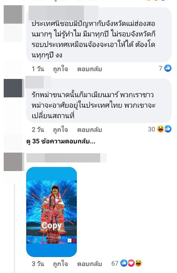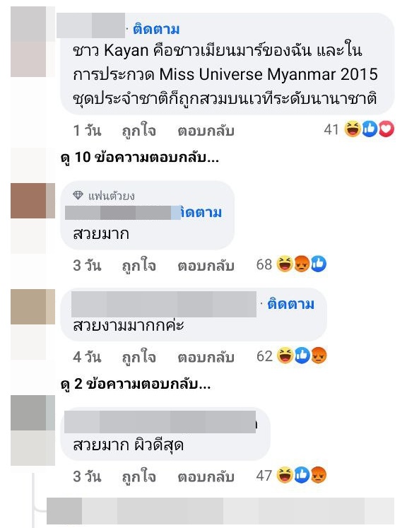 โดยคอมเมนต์ในรูปดังกล่าว ได้มีชาวเมียนมาจำนวนไม่น้อยเข้ามาแสดงตัวว่า ชาว Krayan คือชาวเมียนมา ชุดนี้สื่อถึงวัฒนธรรมของเมียนมา และเคยมีชุดแนวนี้ที่นางงามเมียนมาใส่ประกวดในรอบชุดประจำชาติบนเวทีนางงามอื่นมาแล้ว บ้างก็ลงรูปชุดนี้พร้อมแปะข้อความกล่าวหาว่า "Copy" กันแบบรัว ๆ