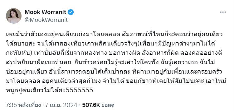 ทำเอาแฟน ๆ เห็นแล้วเอ็นดูกันหนักมาก เมื่อล่าสุด (7 เมษายน 2567) นางเอกสาว มุก วรนิษฐ์ ได้ออกมาโพสต์ผ่านทวิตเตอร์ ขอแก้ข่าวเรื่องของตัวเอง ที่เคยบอกว่า "อยู่คนเดียวได้สบายค่ะ" ตอนนี้รู้แล้วว่า "หนูอยู่คนเดียวไม่ได้ค่ะ" หลังจากได้ไปเที่ยวเกาหลีคนเดียว โดยข้อความทั้งหมดมีดังนี้