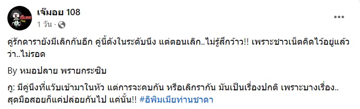 ทำเอาขาเผือกจับตาอีกรอบ เมื่อล่าสุด (8 เมษายน 2567) เพจดัง เจ๊มอย 108 ได้ออกมาเล่าถึงคำทำนายของ หมอปลาย พรายกระซิบ เกี่ยวกับคู่รักดาราที่จะเลิกกันอีกคู่ แต่ชาวเน็ตจะไม่รู้สึกว้าว เพราะคิดไว้อยู่แล้วว่าไม่รอด ดังนี้