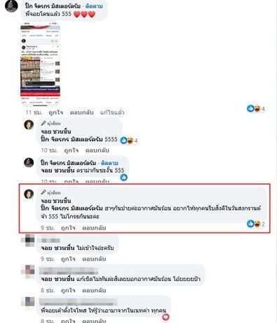 ล่าสุด (12 เมษายน 2567) ก็มีแฟน ๆ เข้าไปคอมเมนต์ในโพสต์ดังกล่าวว่า "พี่จอยโดนแล้ว" ต่อมา จอย ชวนชื่น ก็ได้เข้าไปคอมเมนต์ตอบกลับว่า "ฮา ๆ กันไปค่ะอากาศมันร้อน อยากให้ทุกคนรับสิ่งดีในวันสงกรานต์จ้า 555 ไม่โกรธกันนะคะ"
