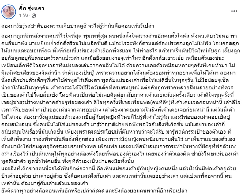 ทำเอาหลายคนเห็นใจและส่งกำลังใจให้ไม่น้อย สำหรับนักร้องสาว กิ๊ก รุ่งนภา ที่ได้เลิกรากับอดีตสามีนักฟุตบอล ซึ่งเจ้าตัวได้เล่าถึงสาเหตุว่าสามีนอกใจไปมีคนอื่น ฝ่ายน้อยท้องทิพย์ อีกทั้งทางแม่ของสามีก็รู้เห็นเป็นใจด้วย โดยสาวกิ๊ก ก็ได้โพสต์ฟาด และอัปเดตเกี่ยวกับเรื่องนี้เป็นระยะ ทั้งเรื่องข้อตกลงในการหย่า การขึ้นศาลต่าง ๆ เรียกว่าเป็นอีกหนึ่งเคส "สงครามสมรส" ในชีวิตจริงกันเลยทีเดียว