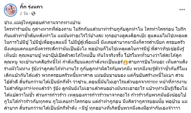โดยเมื่อเร็ว ๆ นี้ กิ๊ก รุ่งนภา ก็ได้ออกมาตอบคำถามจากทางบ้าน หลังมีคนคอมเมนต์ว่า "ไม่รักกันแล้ว ก็อย่าทำร้ายถึงแม่เขา น้องผู้ชายเขาต้องดูแลแม่เขา แม่เขาลำบากมาตั้งแต่เด็ก พอมีครอบครัวและลูกยังเลี้ยง ตัวเองไม่ได้ พ่อก็ป่วยจำอะไรไม่ได้อีก ตัวน้องเขาดิ้นรนกว่าจะได้เป็นนักกีฬาดัง เขาก็ยังไม่ทิ้งแม่เขา ควรภูมิใจและเข้าใจกัน จริง ๆ แม่ก็ขยันยังทำขนมขายตลาดทุกวันนะ ทุกคนอำเภอบางสะพานน้อยรู้จักครอบครัวนี้ดีนะ ไม่ใช่ครอบครัวก้าวร้าว"