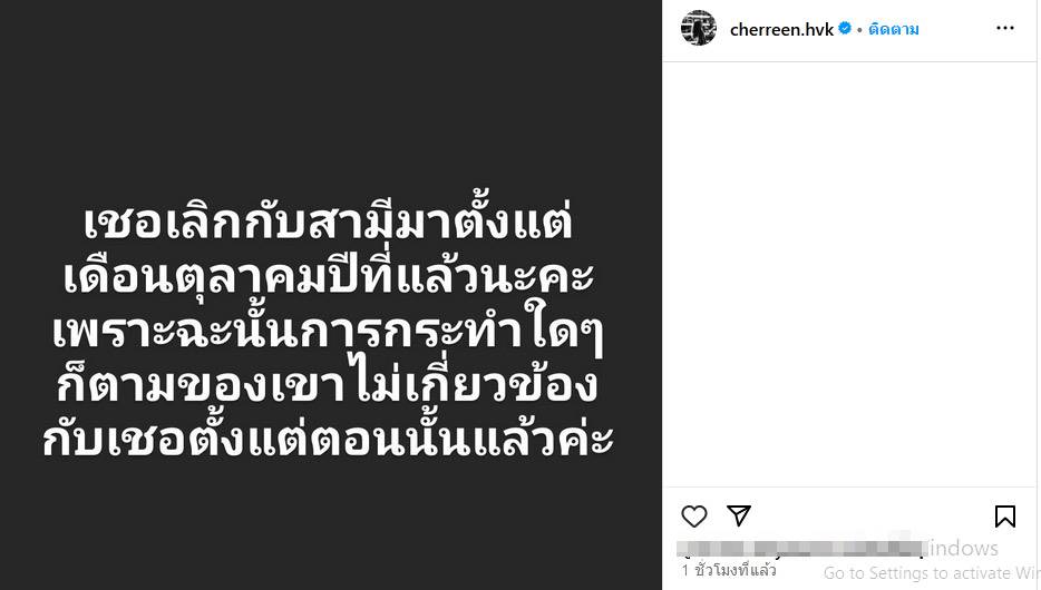ทั้งนี้ เชอรีน ได้ระบุข้อความว่า “เชอเลิกกับสามีมาตั้งแต่เดือนตุลาคมปีที่แล้วนะคะ เพราะฉะนั้นการกระทำใด ๆ ก็ตามของเขาไม่เกี่ยวข้องกับเชอตั้งแต่ตอนนั้นแล้วค่ะ” พร้อมกับปิดคอมเมนต์ ไม่ให้แสดงความคิดเห็นใด ๆ