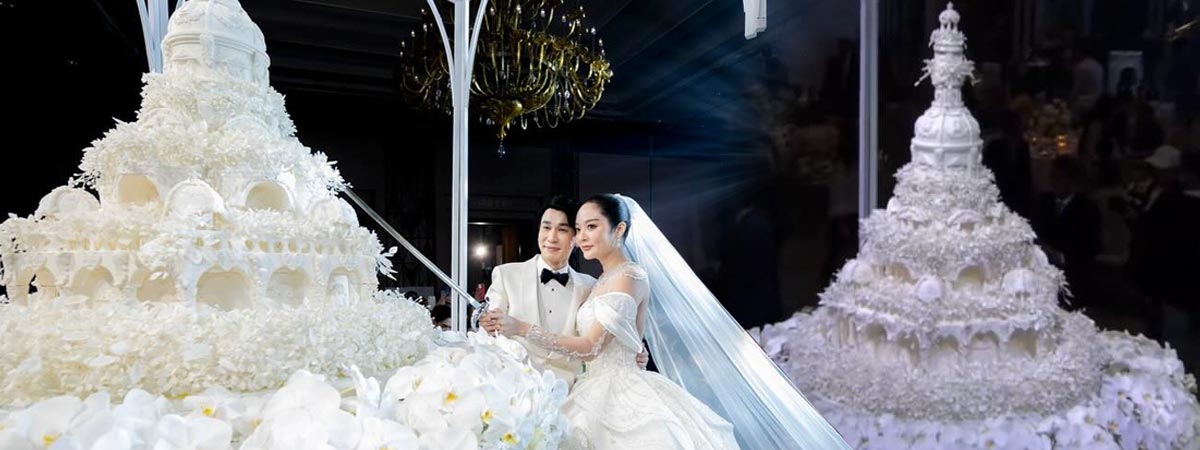 และที่หลายคนต่างพูดถึงไม่แพ้ความหวานของคู่บ่าวสาวก็คือ เค้กงานแต่งงานสีขาวถูกออกแบบมาเป็นพิเศษเพื่อคู่บ่าวสาวโดยเฉพาะ กับธีมปราสาท พร้อมด้วยดอกไม้สีขาวเกือบ 5,000 ดอกที่ปั้นจากน้ำตาลฟองดองท์ ซึ่งมีที่มาสุดอบอุ่น โดยได้ ปลา น้องสาวแท้ ๆ ของพี่พีท เป็นคนลงมือทำด้วยตัวเองเพื่อมอบเป็นของขวัญให้ในวันสำคัญของพี่ชาย ซึ่ง ปลา ได้ร่วมทำเค้กกับทีมอาจารย์ผู้สอน คือเชฟโรส เมอร์เซีย (Rose Mercier) แห่ง Culinary Arts Thailand