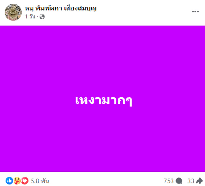 เล่นเอาแฟน ๆ แสดงความเป็นห่วงไม่น้อย สำหรับนักแสดงรุ่นใหญ่ แม่หมู พิมพ์ผกา หลังออกมาโพสต์ว่า เหงามาก ๆ ซึ่งก็มีบางรายคาดเดาว่าอาจจะเกี่ยวกับการที่เจ้าตัวย้ายไปอยู่ที่เขาใหญ่คนเดียว หรือเป็นเพราะลูกชาย นาย ณภัทร ควงแฟนสาว ใบเฟิร์น พิมพชนก ไปเที่ยวต่างประเทศหรือไม่