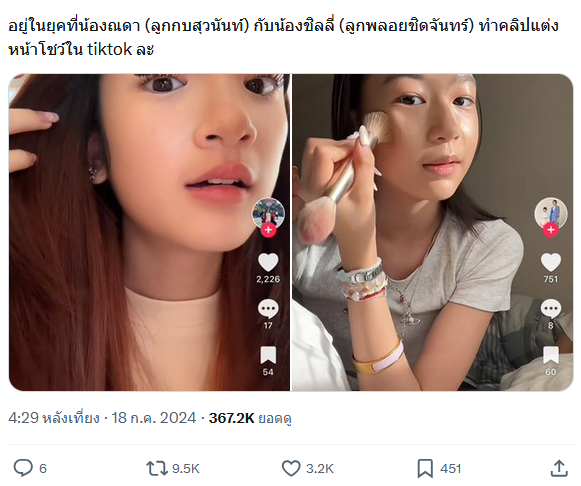 อย่างล่าสุด (19 กรกฎาคม 2567) ก็มีคนออกมาแชร์คลิปที่ น้องณดา กับ น้องชิลลี่ How to แต่งหน้าลงช่อง TikTok ของตัวเอง ซึ่งแต่ละคนก็แต่งหน้าออกมาได้อย่างคล่องแคล่ว เป๊ะปังไม่ไหว เรียกว่าสวยออร่าสมวัยมาก แถมแต่ละคนก็มีความครีเอทีพสุด ๆ เพราะมีคอนเทนต์ให้แฟน ๆ ติดตามเพียบ