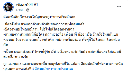 โดย เจ๊มอย ได้สรุปมาคร่าว ๆ ว่า นางเอกตัวแม่ ตัวมัมคนนี้เป็นนางเอกที่ใคร ๆ ก็รู้จัก มีข่าวเรื่องความรักกับผัว แต่เหมือนจะไม่ค่อยมีดวงเรื่องความรัก ล่าสุดดูท่าว่าจะมูฟออนแล้ว เพราะมีคนตาดีควงหนุ่มใหญ่ภูมิฐาน โปรไฟล์เริดออกงานฉ่ำ ทำเอาคนมองว่าหนุ่มคนนี้คือใคร มีสถานะอะไรกับนางเอกสาวตัวแม่ หรือเป็นรักครั้งใหม่หรือเปล่า ซึ่งคนในงานยังบอกอีกว่า นางเอกวางตัวดีมาก สุภาพเรียบร้อย และทั้งคู่ก็ไปไหนมาไหนด้วยกันด้วย