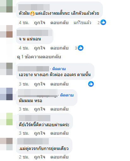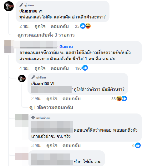 อาทิ อ่านตอนแรกนึกว่ามัม พ. แต่คำใบ้คือมีข่าวเรื่องความรักกับผัว สวยผ่องเอวบาง ตัวแม่ตัวมัม นึกได้ 1 คน คือ จ.น ค่ะ, ตอนแรก็คิดว่าพลอย พอบอกถึงผัวเก่าแล้วน่าจะ จน. จริง, มัม, จน.ทพสว แน่นอน, มีไปเถอะถ้าอยู่กับผัวเก่าแล้วไม่เลิส มีผัวใหม่แล้ว ก็ทำหน้าที่แม่ของลูกให้ดีด้วยก็พอแล้ว คนสวย ใช้หน้าสวย ๆ ให้เป็นประโยชน์ นางเอกอ่ะเนอะ สวยมีกี่คนก็ได้ถ้าเลิกกับผัวเก่าแล้ว, เอวบาง นางเอก ผิวผ่อง ออเคร ตามนั้น, ตัวมัม แต่เอ๊ะเงาผมสั้นนะ เลิกผัวแล้วด้วย, มัมมมม เหรอ ฯลฯ