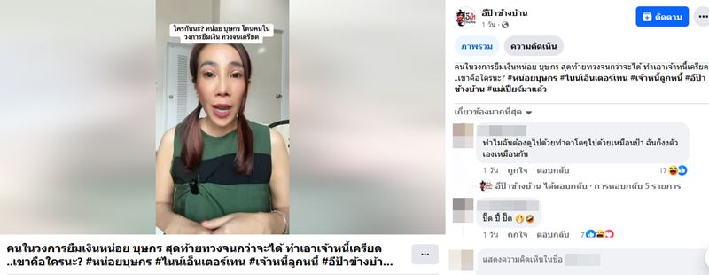โดยบอกว่า "พิธีกรดัง ผู้หญิงคนนี้ หลายคนสงสัยเป็นใคร ที่กล้ามายืมเงิน หน่อย บุษกร และ ตั๊ก มยุรา เป็นระดับไหนทั้งคู่ถึงได้ยอมให้ยืมเงิน จะไม่เอ่ยชื่อแล้วกัน แต่หลายคนก็น่าจะรู้กันแล้ว ทายกันมาแล้ว พิธีกรคนนี้ภาพลักษณ์ดีมาก เมื่อก่อนโด่งดังมาก มีทั้งงานแสดง ร้องเพลงไหม จำไม่ได้ ถ่ายแบบไหม ยุค 90 ก็มีถ่ายแบบแหละ เขาโด่งดังตั้งแต่ตีนฉันเท่าฝาหอย พ่อแม่ฉันรู้จัก บอกคนนี้เก่งทุกอย่างจริง ๆ