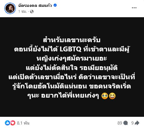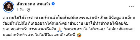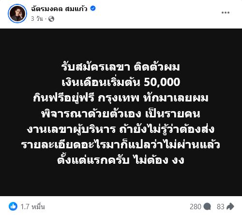 พร้อมเผยถึงเหตุผลที่รับสมัครแต่ผู้ชายกับ LGBTQ ไว้ว่า "ทำงานกรุงเทพ ติดตัวผม กินฟรีอยู่ฟรี เวลาการทำงานยืดหยุ่นมาก ๆ ดูแลผมคนเดียว ถ้าเป็น ชายหรือ LGBTQ จะดีมาก เพราะเมียหึงผู้หญิง แต่ผู้หญิงก็ได้ถ้าเก่งจริง ใครมีความสามารถอะไรใส่เรซูเม่แล้วส่งมาในแชทเลยครับ ผมพิจารณาด้วยตัวเอง ถ้าไม่รู้ว่าจะต้องส่งรายละเอียดอะไรมาก็แปลว่าคุณไม่ผ่านแล้วในเบื้องต้นครับ ไม่ต้องตกใจ"