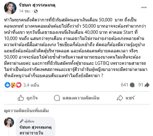 จริง ๆ 50,000 อาจจะน้อยไปด้วยซ้ำสำหรับความสามารถของบางคนไม่เห็นจะต้องมีดราม่าเลยค่ะ และการที่ยิวรับสมัครทั้งผู้ชายและ LGTBQ เพราะความสามารถไม่จำเป็นต้องจำกัดเพศสภาพ และเขารู้ดีว่าถ้ารับผู้หญิงมาอาจจะมีดราม่าตามมาทีหลังหนูว่าเขาก็รอบคอบดีนะ แต่ทำไมถึงยังมีดราม่า ?"