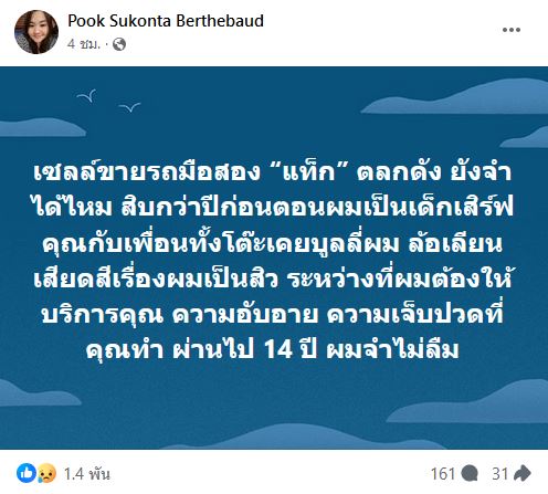 โดยระบุว่า "เซลส์ขายรถมือสอง "แท็ก" ตลกดัง ยังจำได้ไหม สิบกว่าปีก่อนตอนผมเป็นเด็กเสิร์ฟ คุณกับเพื่อนทั้งโต๊ะเคยบูลลี่ผม ล้อเลียนเสียดสีเรื่องผมเป็นสิว ระหว่างที่ผมต้องให้บริการคุณ ความอับอาย ความเจ็บปวดที่คุณทำ ผ่านไป 14 ปี ผมจำไม่ลืม"
