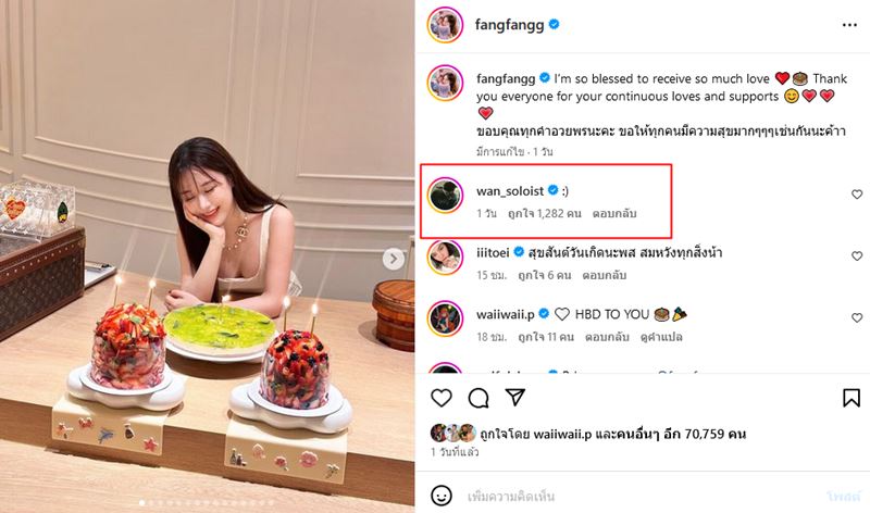 ขณะที่เพื่อน ๆ ดาราและแฟนคลับเข้าไปคอมเมนต์ร่วมอวยพรวันเกิดกันเพียบ และหนึ่งในนั้นก็คือ ว่าน ธนกฤต ที่เข้ามาคอมเมนต์อวยพรสั้น ๆ เป็นอีโมจิหน้ายิ้ม ":)"