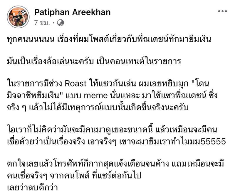 ทางทีมงานของ Katanyu Tonight ขอโพสต์ชี้แจงเกี่ยวกับภาพที่เผยแพร่ในเรื่องของพี่ณเดชน์ที่กำลังเป็นกระแสอยู่ตอนนี้ โดยภาพดังกล่าวแสดงให้เห็นถึงการขอยืมเงินและการคืนเงิน ซึ่งทางเราขอยืนยันว่าทั้งหมดเป็นการสร้างเรื่องขึ้นเพื่อการผลิตคอนเทนต์ สำหรับรายการเท่านั้นไม่มีเหตุการณ์ดังกล่าวเกิดขึ้นจริง