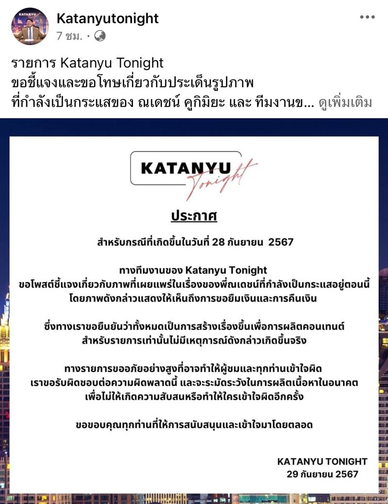 ล่าสุด (29 กันยายน 2567) รายการ Katanyu tonight ได้ร่อนแถลงชี้แจงและขอโทษกับเรื่องที่เกิดขึ้น โดยยอมรับว่าเป็นเพียงคอนเทนต์ที่สร้างสถานการณ์ขึ้น ไม่ได้มีการยืมเงินกันจริง ๆ