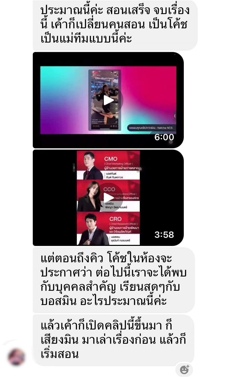 พร้อมเผยภาพข้อมูลจากคนที่เคยเข้าคอร์ส ซึ่งบอกว่า หลังสอนเสร็จ ก็จะเปลี่ยนคนสอนเป็นโค้ชแม่ทีม ซึ่งเมื่อถึงคิวโค้ชในห้องจะประกาศว่า ต่อไปนี้เราจะได้พบกับบุคคลสำคัญ เรียนสด ๆ กับบอสมิน แล้วก็เปิดคลิปขึ้นมา มีเสียงของมินเล่าเรื่อง ก่อนจะเริ่มสอน