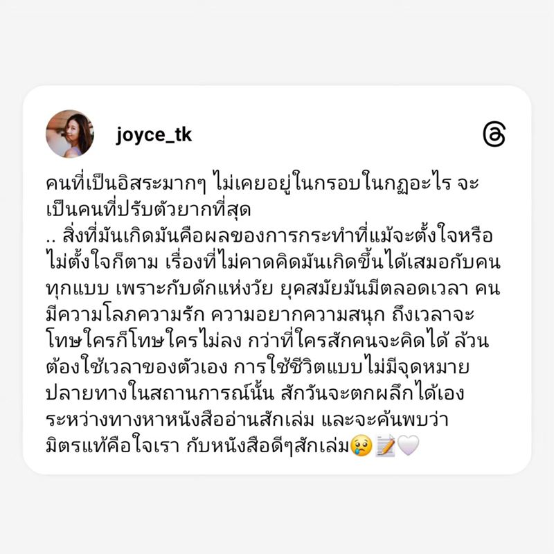 จอยซ์ ทีเค เผย คนที่เป็นอิสระจะปรับตัวยาก มีหนังสือเป็นมิตรแท้ในใจ