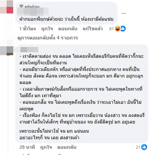 แต่ล่าสุดดาราท่านนี้ก็ยังเอาอดีตสามีไปพูดเสีย ๆ หาย ๆ จนเริ่มจะรับไม่ไหว พร้อมเดินหน้าชน เพราะหลักฐานที่ดาราสาวนอกใจเอย พาผู้ชายขึ้นคอนโดที่สามีออกค่าใช้จ่ายให้หลายครั้ง สลิปการโอนเงินเอย มีอยู่ครบ บอกเลยเรื่องนี้เขย่าวงการบันเทิงแน่ ละที่บอกไม่ต้องการเงิน แต่เบื้องหลังเรียกเงินฉ่ำ วงในญาติสนิทมิตรสหายรู้หมด แต่พูดอะไรไม่ได้เพราะสงสารลูก #ฟอร์จูนเมียทนายไพศาล 5555555"