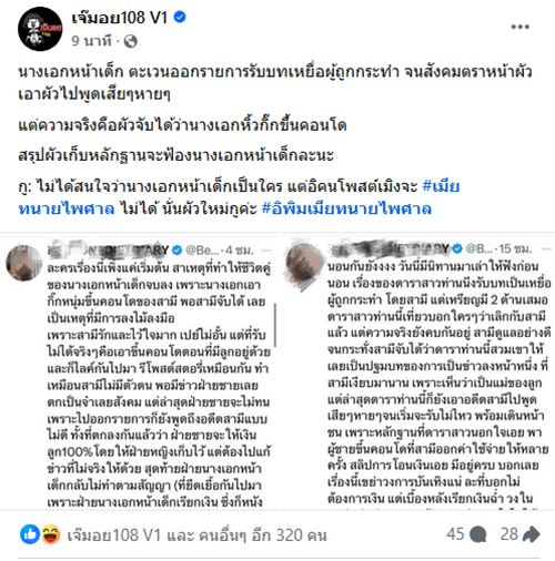 ชาวเน็ตไม่ได้พักได้ผ่อนกันอีกแล้ว เมื่อล่าสุด (27 ตุลาคม 2567) เพจดัง เจ๊มอย 108 ได้ตีประเด็นเด็ดหลังมีผู้ใช้งาน X (ทวิตเตอร์) ออกมาเมาท์แซ่บถึงเรื่องราวของ นางเอกหน้าเด็ก ที่ตระเวนออกรายการรับบทเหยื่อหลังเลิกกับสามี ทำให้สังคมตราหน้าอดีตสามีไปทางเสียหาย จนฝ่ายอดีตสามีจะออกมาฟ้องกลับแล้ว