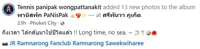 วันที่ 28 ตุลาคม 2567 เฟซบุ๊ก Tennis panipak wongpattanakit ของน้องเทนนิสมีการโพสต์ภาพการไปเที่ยวศรีพันวา จ.ภูเก็ต กับลุคที่ไม่คุ้นเคย พร้อมข้อความว่า "ถึงเวลา ได้กลับมาใช้ชีวิตแล้ว !! Long time, no sea."