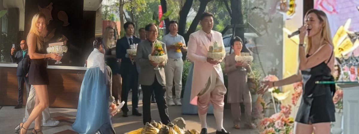 โดย กาฮี มาร่วมงานในชุดเดรสสายเดี่ยวสีดำ เซ็กซี่เบา ๆ ไม่ทิ้งความเป็นตัวแม่ แต่พอเลื่อนไปอีกภาพก็เซอร์ไพรส์กว่าเก่า เพราะเป็นรูปที่ กาฮี ร่วมเดินขบวนขันหมาก แถมยังถือพานขันหมาก ซึ่งคาดว่าน่าจะเป็นหนึ่งในสินสอด ก่อนจะมีคนเฉลยว่าเพราะเจ้าสาวของพี่ชายคือคนไทย จึงได้จัดพิธีแต่งงานตามประเพณีไทย โดยในงาน กาฮี ยังได้ขึ้นร้องเพลงแสดงความยินดีกับคู่บ่าว-สาว ด้วย