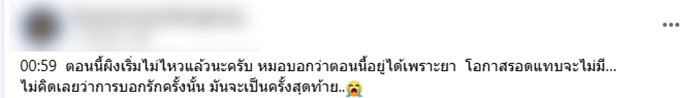 กระทั่งวันที่ 6 ธันวาคม แฟนหนุ่มแจ้งว่านักร้องสาวเกล็ดเลือดต่ำมาก ต้องรับบริจาคเลือด และวานนี้ (7 ธันวาคม) เธอเริ่มไม่ไหวแล้ว หมอบอกว่าอยู่ได้เพราะยา โอกาสรอดแทบจะไม่มี "ไม่เคยคิดเลยว่าการบอกรักครั้งนั้น มันจะเป็นครั้งสุดท้าย"