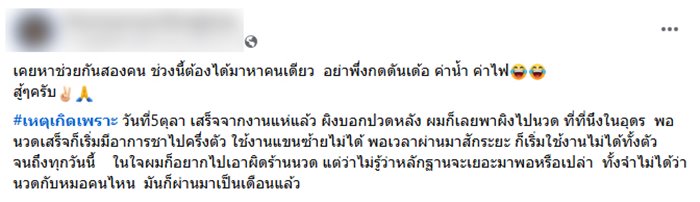 "เคยหาช่วยกันสองคน ช่วงนี้ต้องได้มาหาคนเดียว อย่าเพิ่งกดดันเด้อ ค่าน้ำ ค่าไฟ สู้ ๆ ครับ #เหตุเกิดเพราะ วันที่ 5 ตุลา เสร็จจากงานแห่แล้ว ผิงบอกปวดหลัง ผมก็เลยพาผิงไปนวด ที่ที่นึงในอุดร พอนวดเสร็จก็เริ่มมีอาการชาไปครึ่งตัว ใช้งานแขนซ้ายไม่ได้ พอเวลาผ่านมาสักระยะ ก็เริ่มใช้งานไม่ได้ทั้งตัว จนถึงทุกวันนี้