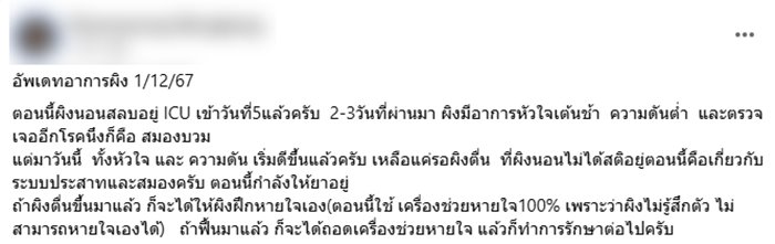 ถ้าเธอตื่นมาแล้วก็จะให้ฝึกหายใจเอง เพราะตอนนี้ใช้เครื่องช่วยหายใจ 100% เนื่องจากเธอไม่รู้สึกตัว ไม่สามารถหายใจเองได้ ถ้าฟื้นมาแล้วก็จะได้ถอดเครื่องช่วยหายใจออกแล้วทำการรักษาต่อไป