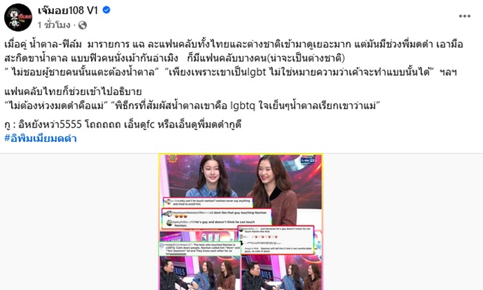 ขณะที่แฟนคลับชาวไทยก็ต้องรีบเข้าไปเบรกดราม่าเป็นการด่วน พร้อมอธิบายสร้างความเข้าใจใหม่ หลายคนก็บอกว่า มดดำ แตะฟีลเอ็นดู ฟีลคนเมาท์มอย แถม น้ำตาล ยังเรียก มดดำ ว่า แม่ อีกต่างหาก ไม่อยากให้เข้าใจผิดไปไกล อาทิ ไม่ต้องห่วงมดดำคือแม่, พิธีกรที่สัมผัสน้ำตาลเขาคือ lgbtq+ ใจเย็น ๆ น้ำตาลเรียกเขาว่าแม่ ฯลฯ