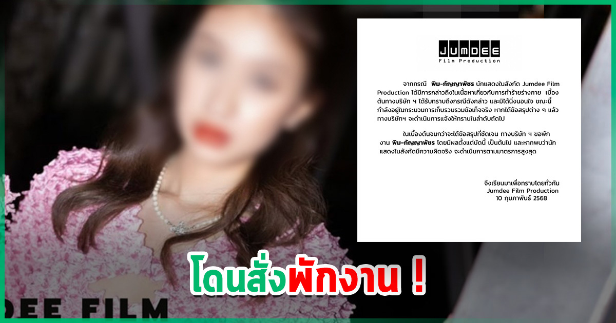 จากนั้นไม่นาน เฟซบุ๊ก Jumdee Film Production ได้ออกมาแถลงกรณี พิม กัญญาพัชร นักแสดงในสังกัด ถูกกล่าวถึงในเนื้อหาเกี่ยวกับการทำร้ายร่างกาย โดยทางค่ายเผยว่าได้รับทราบเรื่องแล้ว อยู่ในกระบวนการรวบรวมข้อเท็จจริง หากได้ข้อสรุปจะแจ้งให้ทราบต่อไป โดยในเบื้องต้นได้ขอพักงาน พิม กัญญาพัชร ตั้งแต่บัดนี้เป็นต้นไป และหากพบว่ามีความผิดจริง จะดำเนินการตามมาตรการสูงสุด