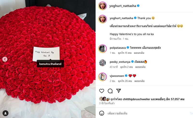 แต่ก่อนจะพากันแซวไปไกล สาวโยเกิร์ต ก็ได้เฉลยว่า B เจ้าของช่อดอกกุหลาบช่อนี้ก็คือเพื่อนร่วมงานที่ทำธุรกิจใหม่ร่วมงานกันนั่นเอง โดยบอกว่า "Thank you เพื่อนร่วมงานกลัวเหงาวันวาเลนไทน์ เลยส่งดอกไม้มาให้ Happy Valentine's to you all na ka"