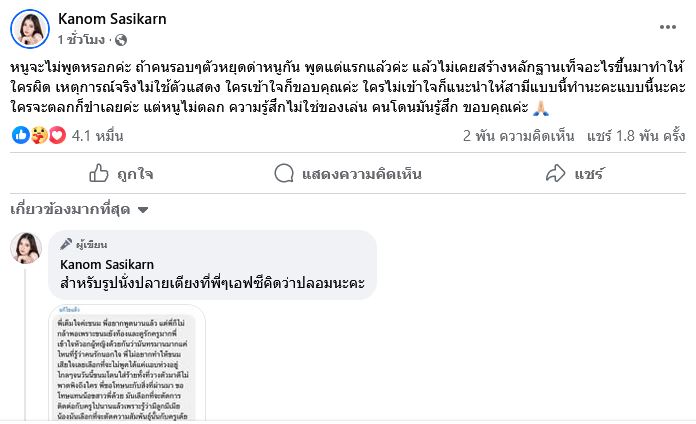 ล่าสุด (18 กุมภาพันธ์ 2568) ขนม ได้ออกมาเคลื่อนไหวอีกครั้ง โพสต์ฟาดคนที่กล่าวหา พร้อมยืนยันว่าหลักฐานเป็นภาพจริง ไม่มีการสร้างภาพเท็จขึ้นมาแต่อย่างใด "หนูจะไม่พูดหรอกค่ะ ถ้าคนรอบ ๆ ตัวหยุดด่าหนูกัน พูดแต่แรกแล้วค่ะ แล้วไม่เคยสร้างหลักฐานเท็จอะไรขึ้นมาทำให้ใครผิด เหตุการณ์จริงไม่ใช้ตัวแสดง ใครเข้าใจก็ขอบคุณค่ะ ใครไม่เข้าใจก็แนะนำให้สามีแบบนี้ทำนะคะแบบนี้นะคะ ใครจะตลกก็ขำเลยค่ะ แต่หนูไม่ตลก ความรู้สึกไม่ใช่ของเล่น คนโดนมันรู้สึก ขอบคุณค่ะ"