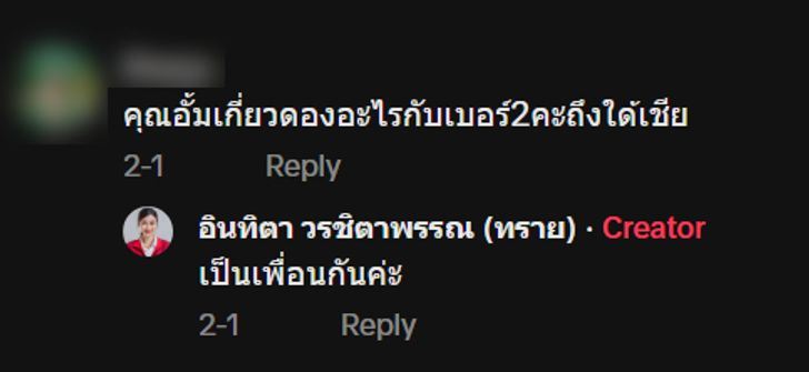 ด้าน ทราย อินทิตา ได้ตอบกลับอย่างชัดเจนว่า "สรุปไม่มีมือที่สามค่ะ ทรายเป็นเพื่อนกับคุณอั้มมานานแล้ว และมีครอบครัวแล้วค่ะ คุณอั้มกับคุณนัทเลิกกัน เป็นเรื่องระหว่างคน 2 คน ตั้งแต่เลิกกัน คุณอั้มก็ยังไม่ได้คบใครนะคะ"
