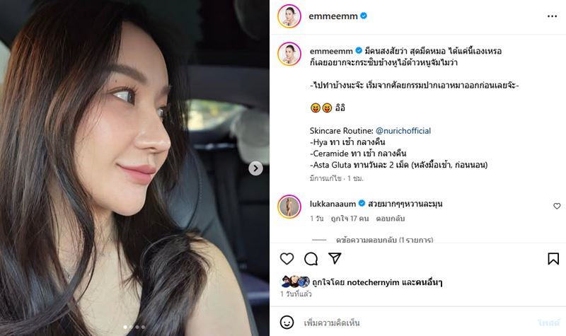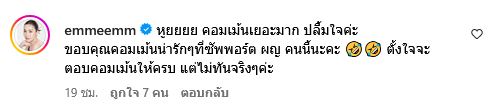 เรียกว่าฟาดนิ่ม ๆ แต่เจ็บจี๊ดเล่นเอาหน้าหงายกันเลยทีเดียว ขณะที่อีกด้านก็มีคนเข้ามาชมความสวยปังของ สาวเอ็ม กันเพียบ ซึ่งเจ้าตัวก็ได้เข้ามาขอบคุณว่า "หูยยยย คอมเมนต์เยอะมาก ปลื้มใจค่ะ ขอบคุณคอมเมนต์น่ารัก ๆ ที่ซัพพอร์ต ผญ คนนี้นะคะ ตั้งใจจะตอบคอมเมนต์ให้ครบ แต่ไม่ทันจริง ๆ ค่ะ"