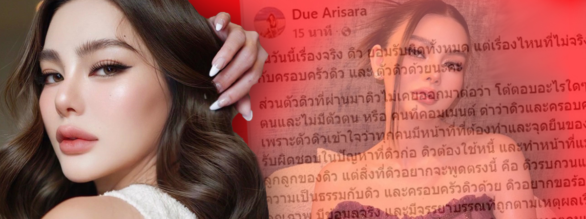 วันที่ 21 มีนาคม 2568 ดิว อริสรา มีการโพสต์เฟซบุ๊กเขียนความในใจถึงดราม่าล่าสุดว่า ในวันนี้เรื่องจริง ดิว ยอมรับผิดทั้งหมด แต่เรื่องไหนที่ไม่จริง ตรงนี้ดิวต้องขอความเป็นธรรม ให้กับครอบครัวดิวและตัวดิวด้วยนะคะ