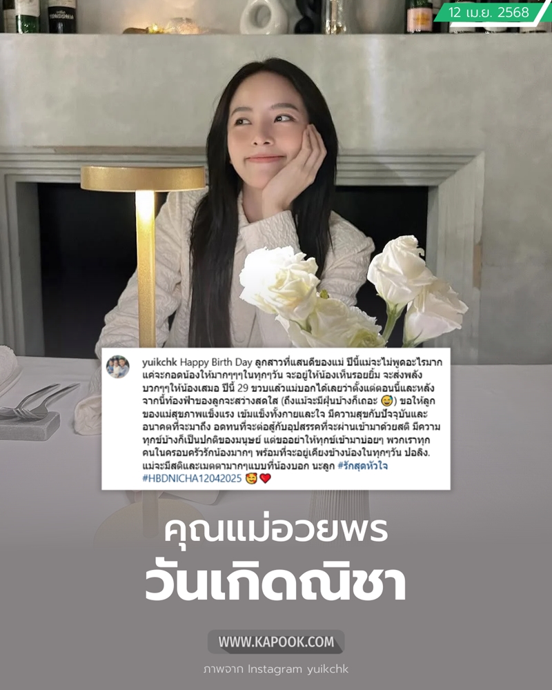 โดยระบุว่า "Happy Birth Day ลูกสาวที่แสนดีของแม่ ปีนี้แม่จะไม่พูดอะไรมากแค่จะกอดน้องให้มากๆๆๆในทุกๆวัน จะอยู่ให้น้องเห็นรอยยิ้ม จะส่งพลังบวกๆๆให้น้องเสมอ ปีนี้ 29 ขวบแล้วแม่บอกได้เลยว่าตั้งแต่ตอนนี้และหลังจากนี้ท้องฟ้าของลูกจะสว่างสดใส (ถึงแม้จะมีฝุ่นบ้างก็เถอะ) ขอให้ลูกของแม่สุขภาพแข็งแรง เข้มแข็งทั้งกายและใจ มีความสุขกับปัจจุบันและอนาคตที่จะมาถึง อดทนที่จะต่อสู้กับอุปสรรคที่จะผ่านเข้ามาด้วยสติ มีความทุกข์บ้างก็เป็นปกติของมนุษย์ แต่ขออย่าให้ทุกข์เข้ามาบ่อยๆ พวกเราทุกคนในครอบครัวรักน้องมากๆ พร้อมที่จะอยู่เคียงข้างน้องในทุกๆวัน ปอลิง. แม่จะมีสติและเมตตามาก ๆ แบบที่น้องบอก นะลูก #รักสุดหัวใจ #HBDNICHA12042025 "