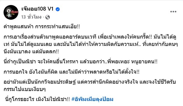 ทางด้านเพจ เจ๊มอย 108 ก็โพสต์ฉะว่า "คำพูดแสนห้า การกระทำแสนเฮีย !! การเอาเรื่องส่วนตัวมาพูดแอ็คอาร์ตบนเวที เพื่อเข้าเพลงให้คนกรี๊ด!! มันไม่ได้ดูเท่ มันไม่ได้ดูแมนเลย และมันไม่ได้ทำให้ความผิดกับความเห้.. ที่เคยทำกับคนคนนึงมันเบาลง แต่มันตลก !! นี่ถ้ากูเป็นณิชา จะให้คนอื่น โทร.หา แล้วบอกว่า..พี่พอเหอะ หนูอายคน !! การนอกใจ ยังไงมันก็ผิด และไม่มีคำว่าพลาดหรือไม่ได้ตั้งใจ !! อย่ามัวแต่เป็นนักกวีจอมประดิษฐ์ แต่ควรสำนึกผิดอย่างจริงใจ และจงใช้ชีวิตรับกรรมไปแบบเงียบ ๆ นี่กูโกรธอะไร เมิงไม่ใช่ณิชา!! #อิพิมเมียลุงป้อม"