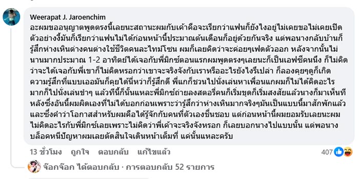 ขณะที่หนุ่มกล้ามล่ำก็ออกมาชี้แจงว่า ตนเองกับ มิกซ์ เพิ่งเจอกันได้แค่ 4 วัน และเพิ่งตกลงเรื่องความสัมพันธ์กันจริงจังก่อนที่ภาพจะออก ส่วนกับคนในแชตจะบอกว่าเป็นแฟนก็ไม่ได้ เพราะไม่เคยขอคบ ไม่เคยเปิดตัว