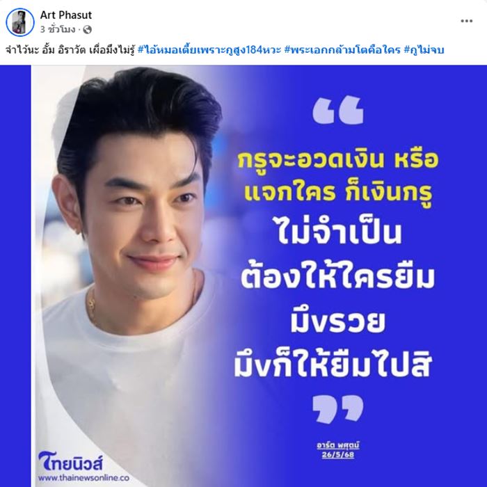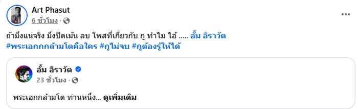 จากเหตุดราม่าฟาดเดือดกันข้ามคืน ระหว่าง อั้ม อิราวัต หรือ หมออั้ม กับ อาร์ต พศุตม์ หลังหมออั้มโพสต์แฉ "พระเอกกล้ามโต" ที่ไม่ให้ผู้ใหญ่ที่เคยช่วยเหลือยืมเงิน จนหนุ่มอาร์ตทนไม่ไหว ออกมาสวดยับ พร้อมตั้งข้อสงสัยว่าหมออั้มเป็นคนให้พี่คนนั้นมายืมเงินตนหรือไม่ ถึงดูเดือดร้อนนัก พร้อมท้าไปออกโหนกระแส ซึ่งแม้ต่อมา หมออั้มจะยอมขอโทษ แต่ทางฝั่งนี้ยังไม่จบง่าย ๆ