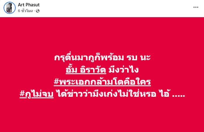 "กรุตื่นมากูก็พร้อมรบ นะ อั้ม อิราวัต มึงว่าไง #พระเอกกล้ามโตคือใคร #กูไม่จบ ได้ข่าวว่ามึงเก่งไม่ใช่หรอ ไอ้..."