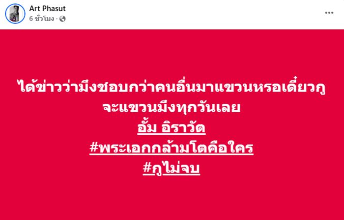 นอกจากนี้ อาร์ต ยังมีการลงภาพโควตคำพูดของตัวเองว่า "กรูจะอวดเงิน หรือแจกใคร ก็เงินกรู ไม่จำเป็นต้องให้ใครยืม มึงรวย มึงก็ให้ยืมไปสิ" พร้อมบอกชัด ๆ จำไว้นะ อั้ม อิราวัต เผื่อยังไม่รู้...