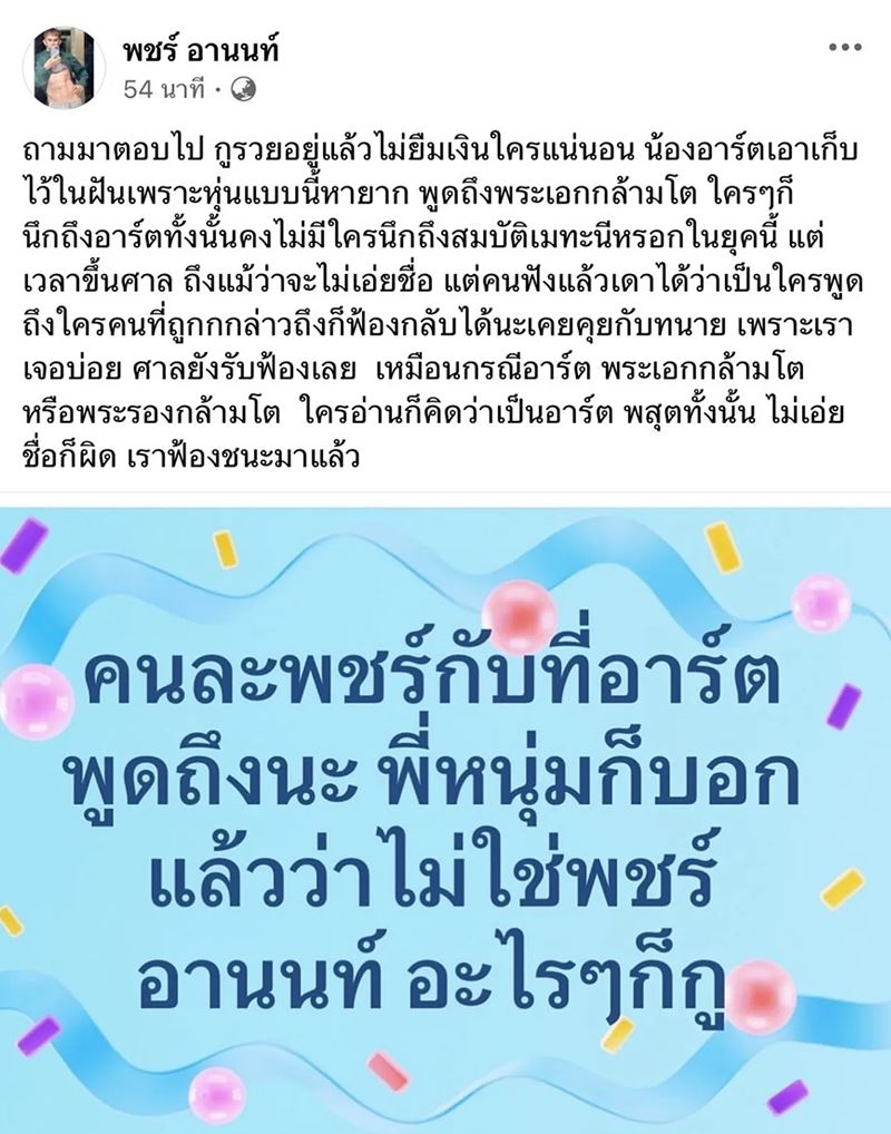 โดย พชร์ อานนท์ โพสต์ข้อความผ่านโซเชียลว่า… “คนละพชร์กับที่อาร์ตพูดถึงนะ พี่หนุ่มก็บอกแล้วว่าไม่ใช่พชร์ อานนท์ อะไร ๆ ก็กู”