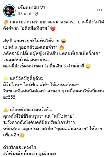 เรียกได้ว่าแรงตามสไตล์ตัวแม่ ซึ่งทางเพจ เจ๊มอย108 V1 ก็ได้โพสต์ถึงประเด็นนี้เพิ่มเติมว่า "กูแค่ใบ้ว่านางร้ายบางคนน่าสงสาร… ป่านนี้ยังไม่ได้ตังค์จาก "อดีตมือที่สาม"