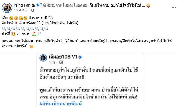 ขณะเดียวกัน หนิง ปณิตา ยังนำโพสต์ดังกล่าวไปแชร์ต่อ พร้อมระบุข้อความ "เอิ่ม !! เราเหรอนี่ ??? จิบไวน์ด้วย จริงอะ ?? (โดนBlock มิน่าไม่เห็น) ปาร์ตี้ ออกรอบ (กอล์ฟ เทนนิส)