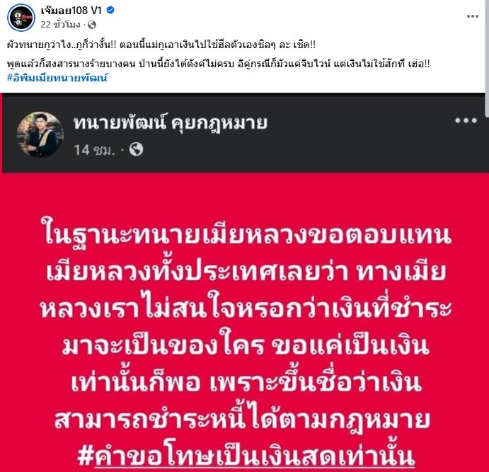 เป็นประเด็นที่หลายคนจับตา หลังจากที่เพจดัง เจ๊มอย108 V1 ลงโพสต์ข้อความจากทนายเมียหลวง ที่ออกมาพูดถึงเงินที่เมียน้อยต้องจ่ายให้ ซึ่งทางเพจระบุว่า "ผัวทนายกูว่าไง..กูก็ว่างั้น !! ตอนนี้แม่กูเอาเงินไปใช้ฮีลตัวเองชิล ๆ ละ เชิด !! พูดแล้วก็สงสารนางร้ายบางคน ป่านนี้ยังได้ตังค์ไม่ครบ อิคู่กรณีก็มัวแค่จิบไวน์ แต่เงินไม่ใช้สักที เฮ่อ !"