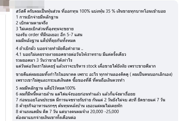 "สวัสดี ครับผมเป็นหุ้นส่วน ที่ออกทุน 100% แบ่งหุ้น 35 % เงินขายทุกบาทโอนเข้าบอย